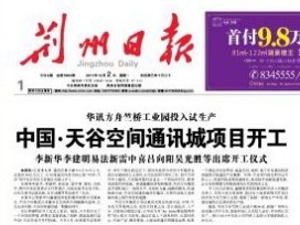 8月11日,荊州電視臺再次采訪并報道了華訊方舟科技(湖北)有限公司竺橋工業園和中國天谷荊州項目進展?! 蟮婪Q,近兩年荊州的電子信息產業異軍突起,其中塊頭最大,投資最多